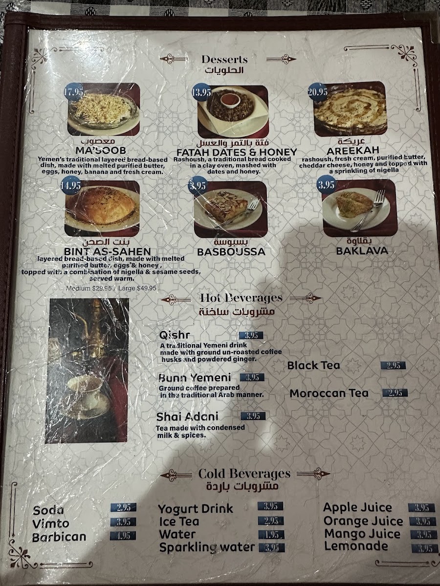 Overall, the menu caters to casual dining with options for both quick orders and more leisurely meals, featuring a balance of beverages, soups, main courses, and desserts that reflect authentic Yemeni culinary traditions.