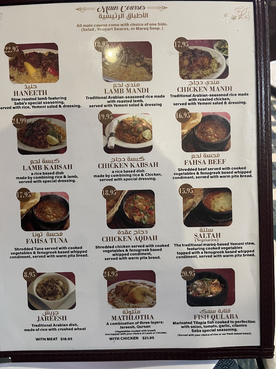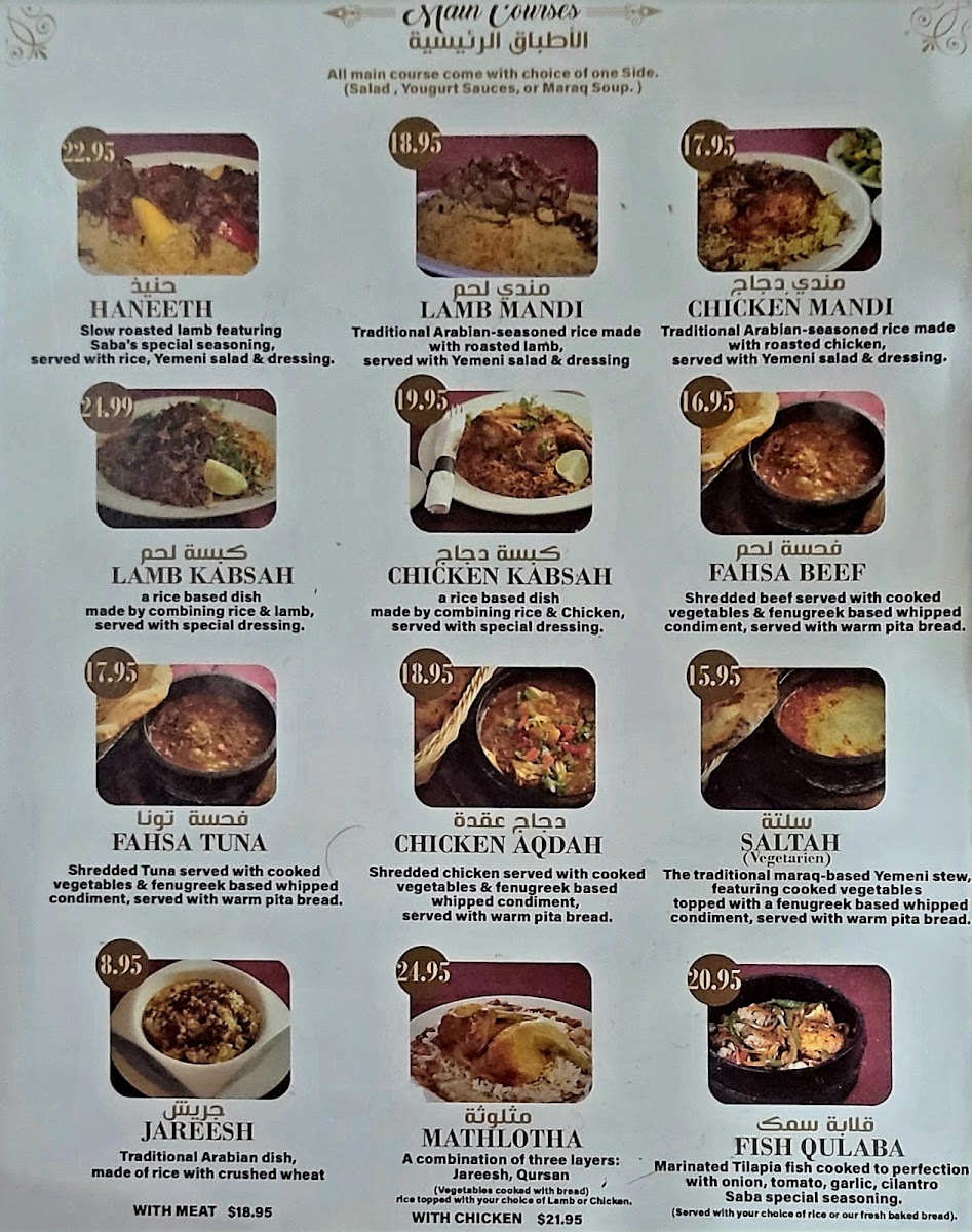 The menu at Saba Restaurant features a variety of traditional Yemeni dishes and beverages, organized into several categories to accommodate different dining preferences. Visitors can explore hot beverages such as Qishr, Bunn Yemeni coffee, Shai Adani tea with milk, and various sizes of Arabic coffee and black tea, suitable for coffee breaks or light refreshment.